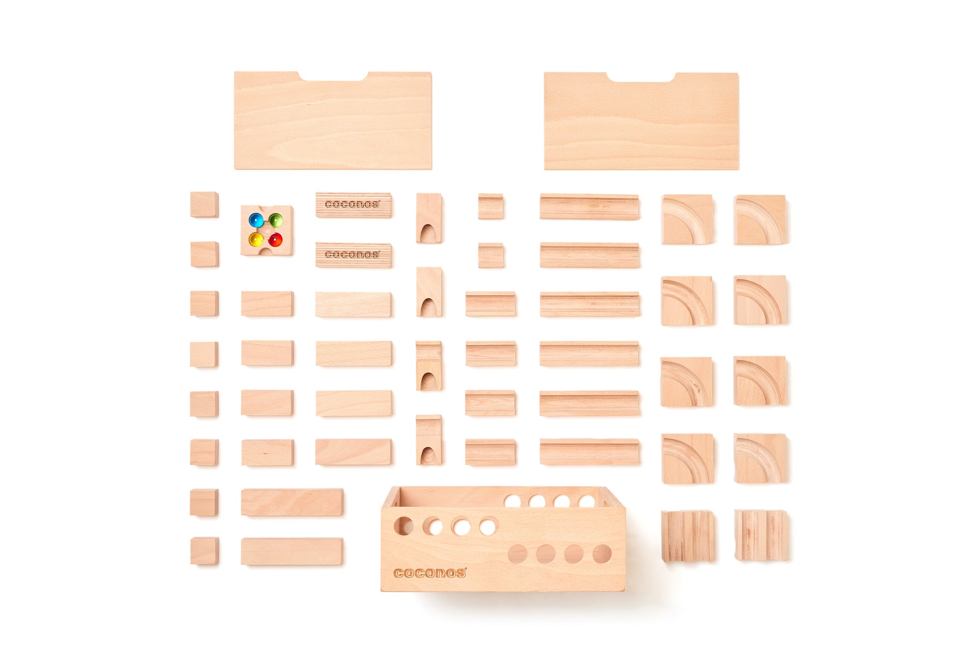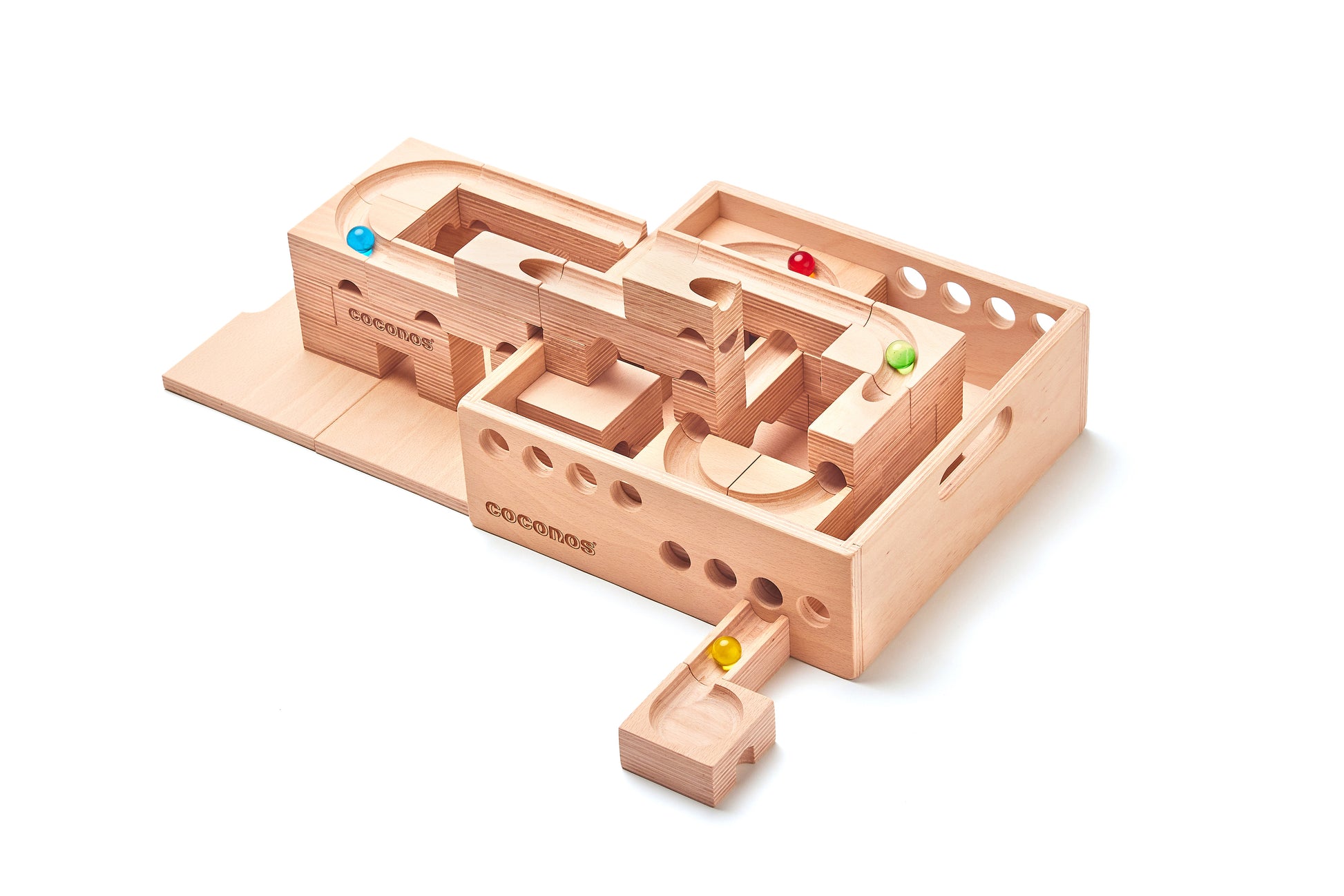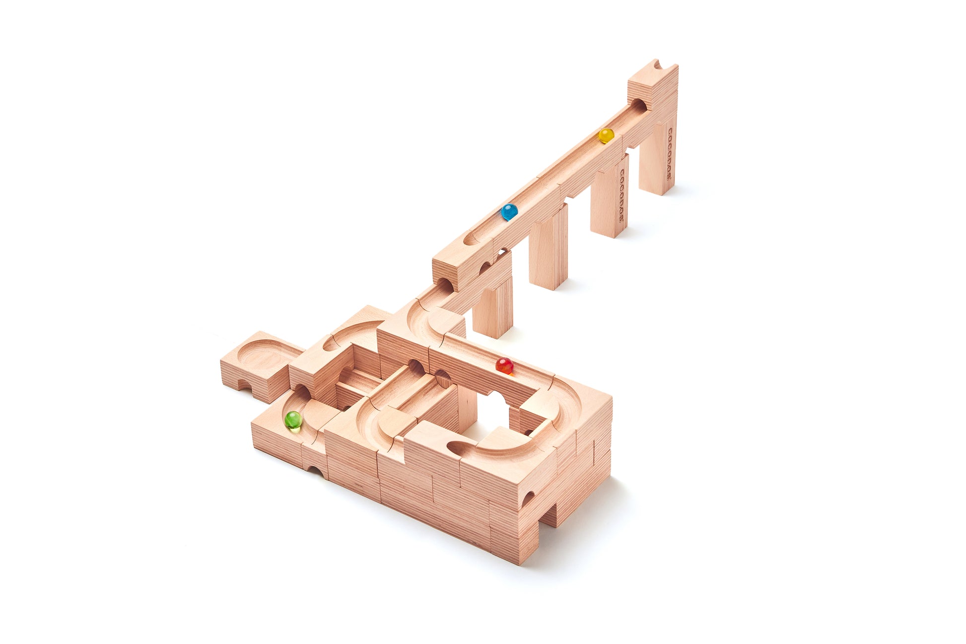 oconos は、ビー玉が転がる道を見えない空間まで考えながら積み上げていく少し高度な積み木遊びです。