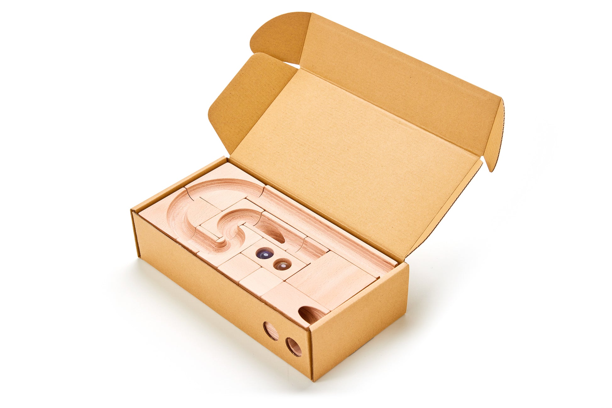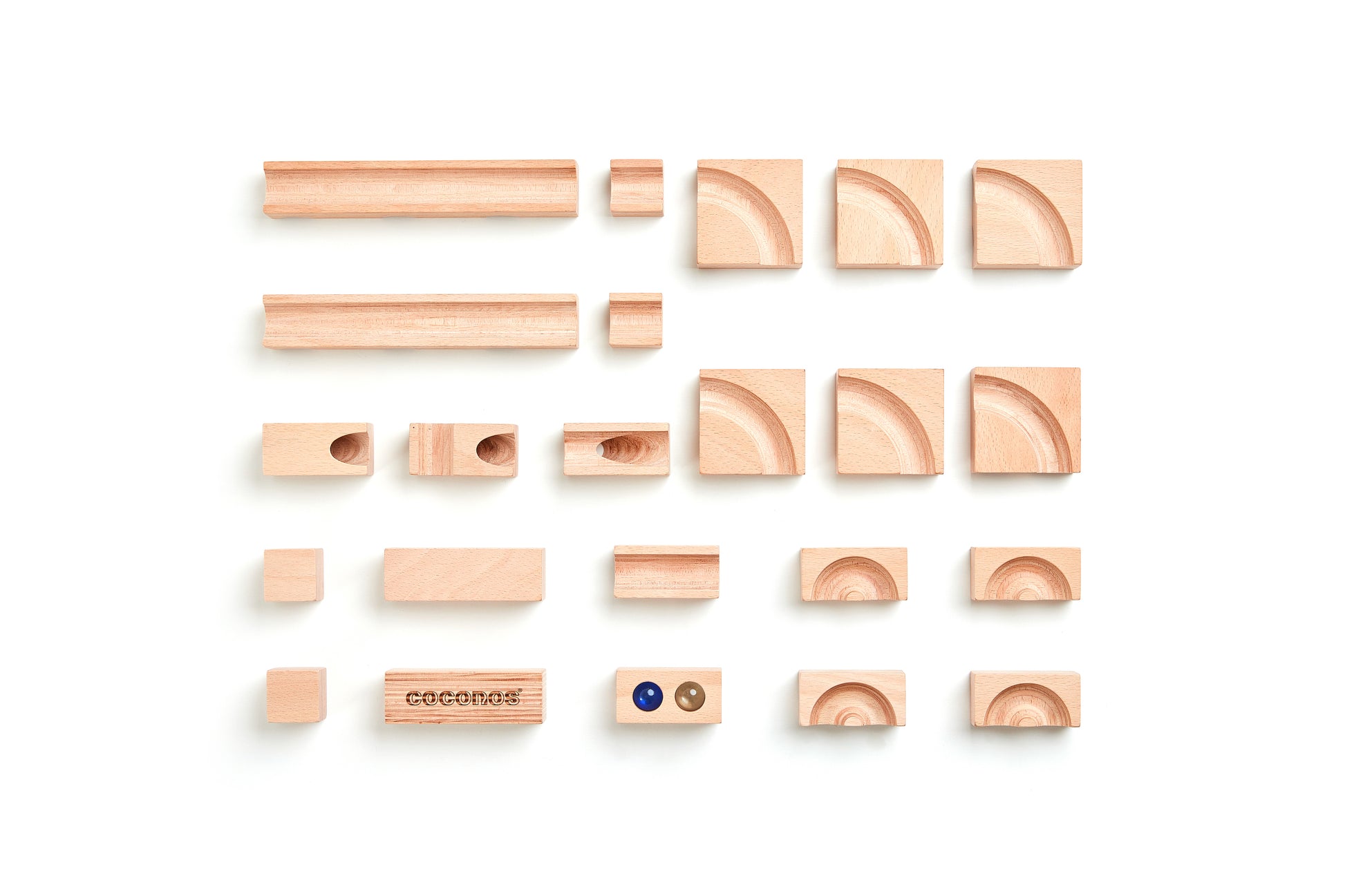 coconos は、ビー玉が転がる道を見えない空間まで考えながら積み上げていく少し高度な積み木遊びです。