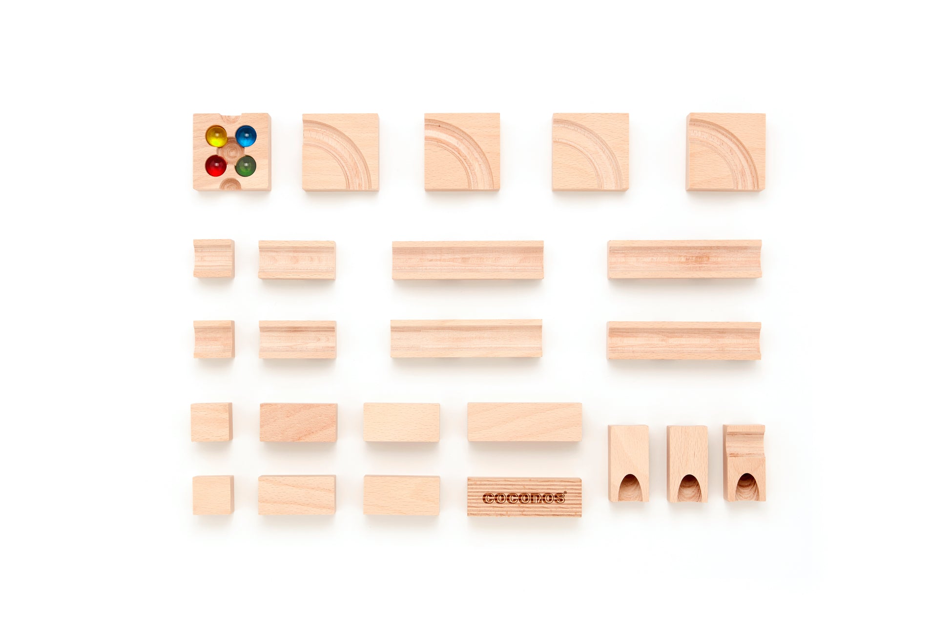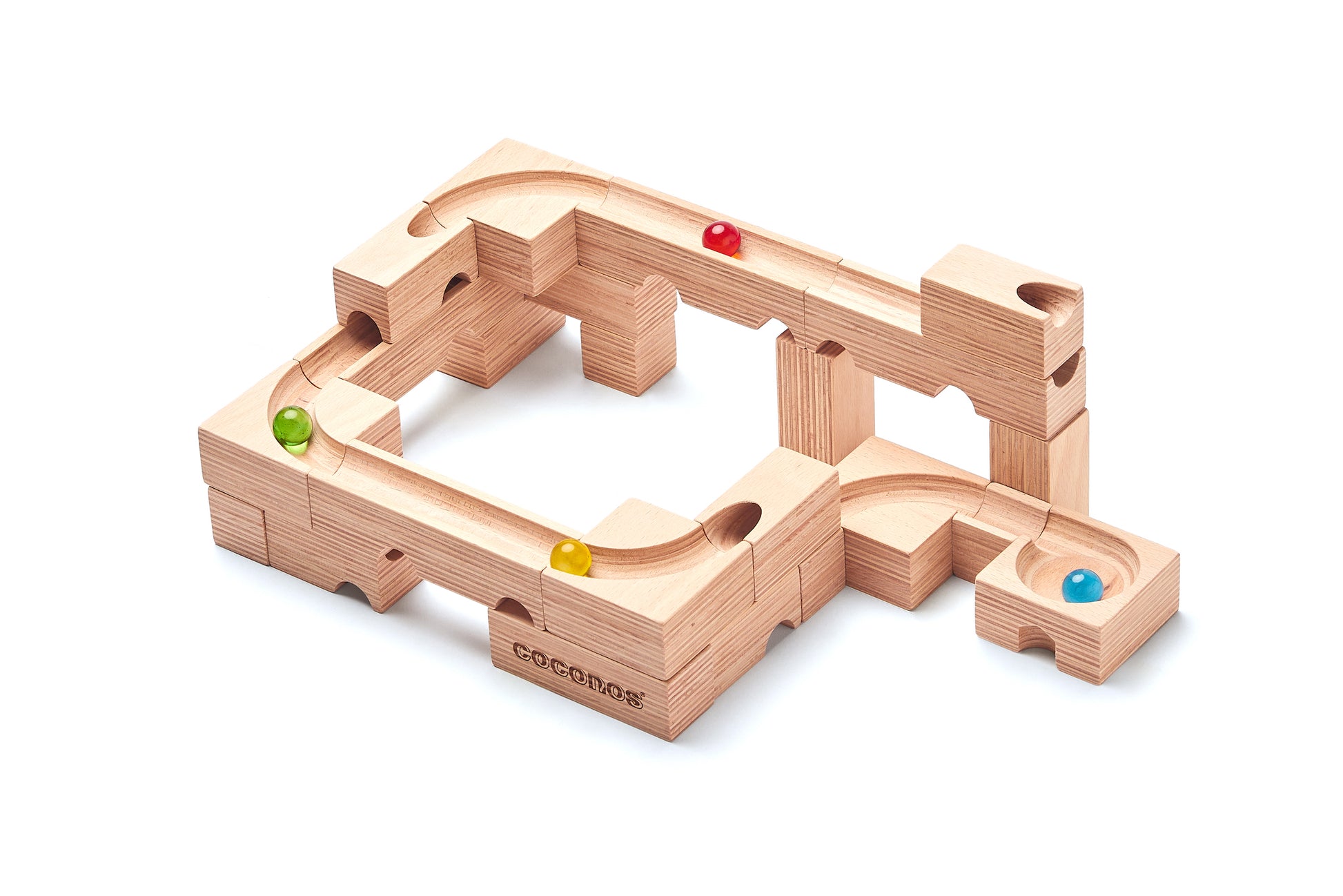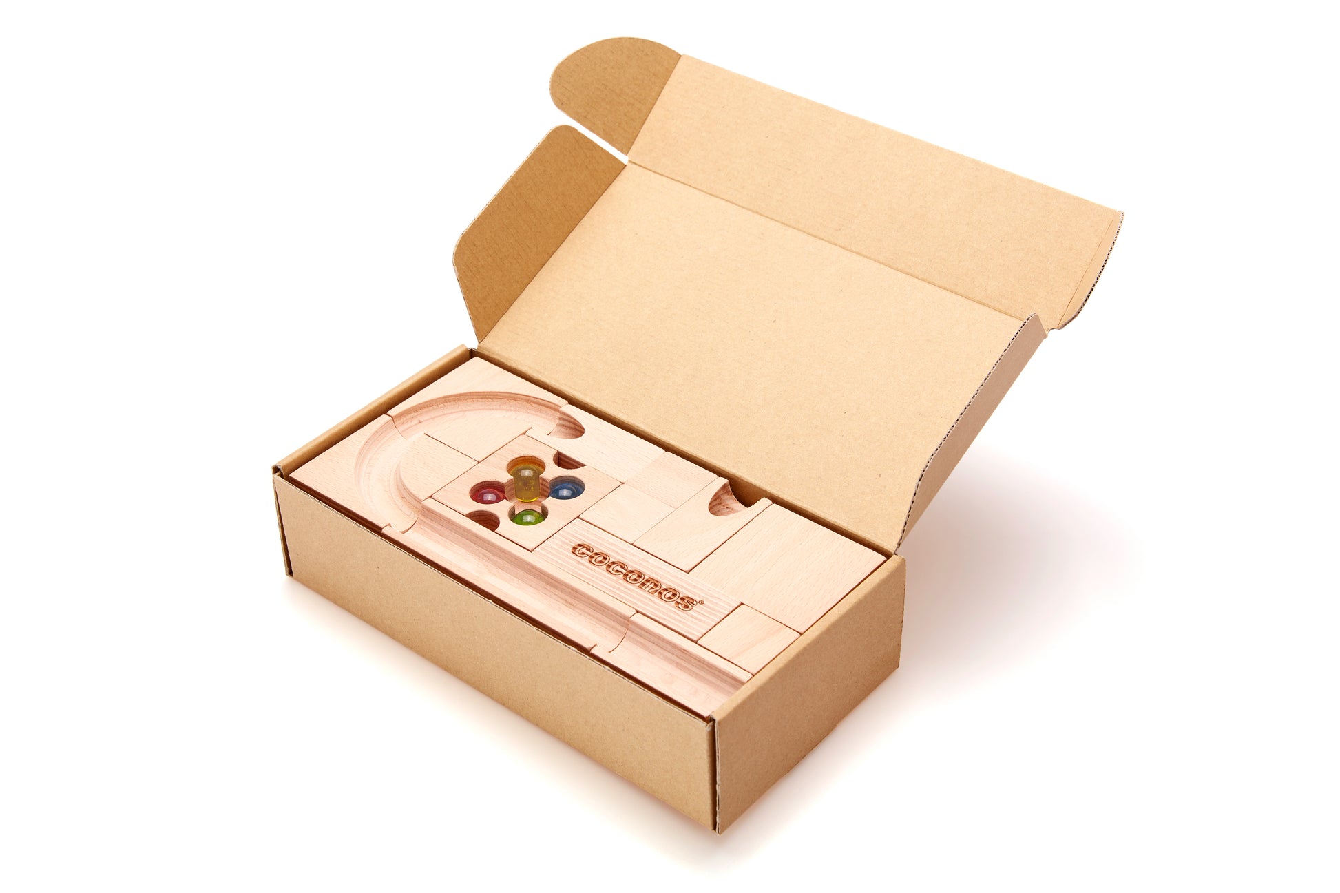 coconos は、ビー玉が転がる道を見えない空間まで考えながら積み上げていく少し高度な積み木遊びです。