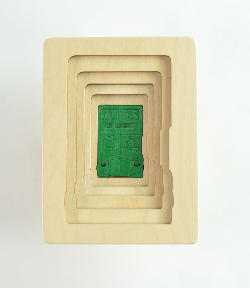 5層のパズルです。それぞれの層が1枚の木板で出来ているので、幼児にも遊びやすいお勧めのパズルです。