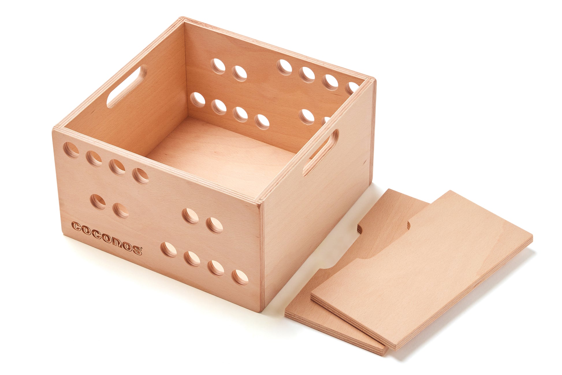 coconos4に付属している専用木箱です。256マス分のパーツを収納することができます。例えば、coconos2と、拡張セットを2種類を収納することができます。ひっくり返して遊ぶ際には、5段分の高さとぴったり合うようになっています。