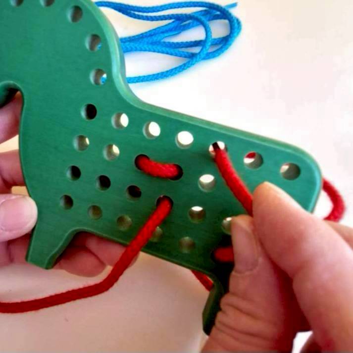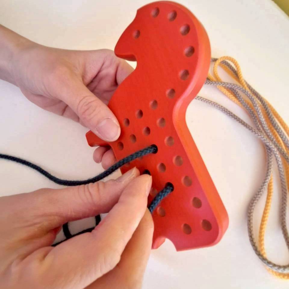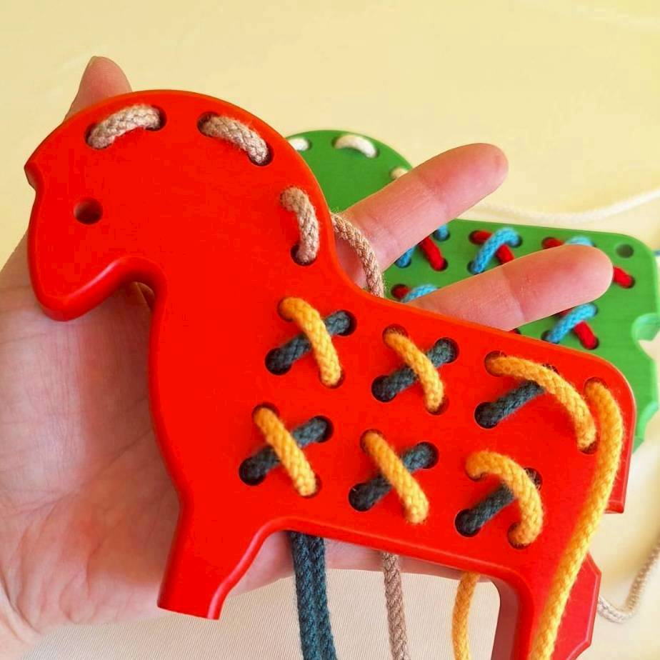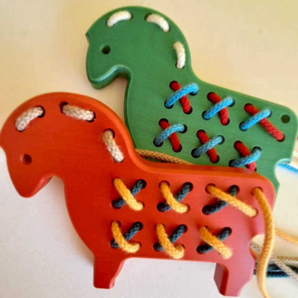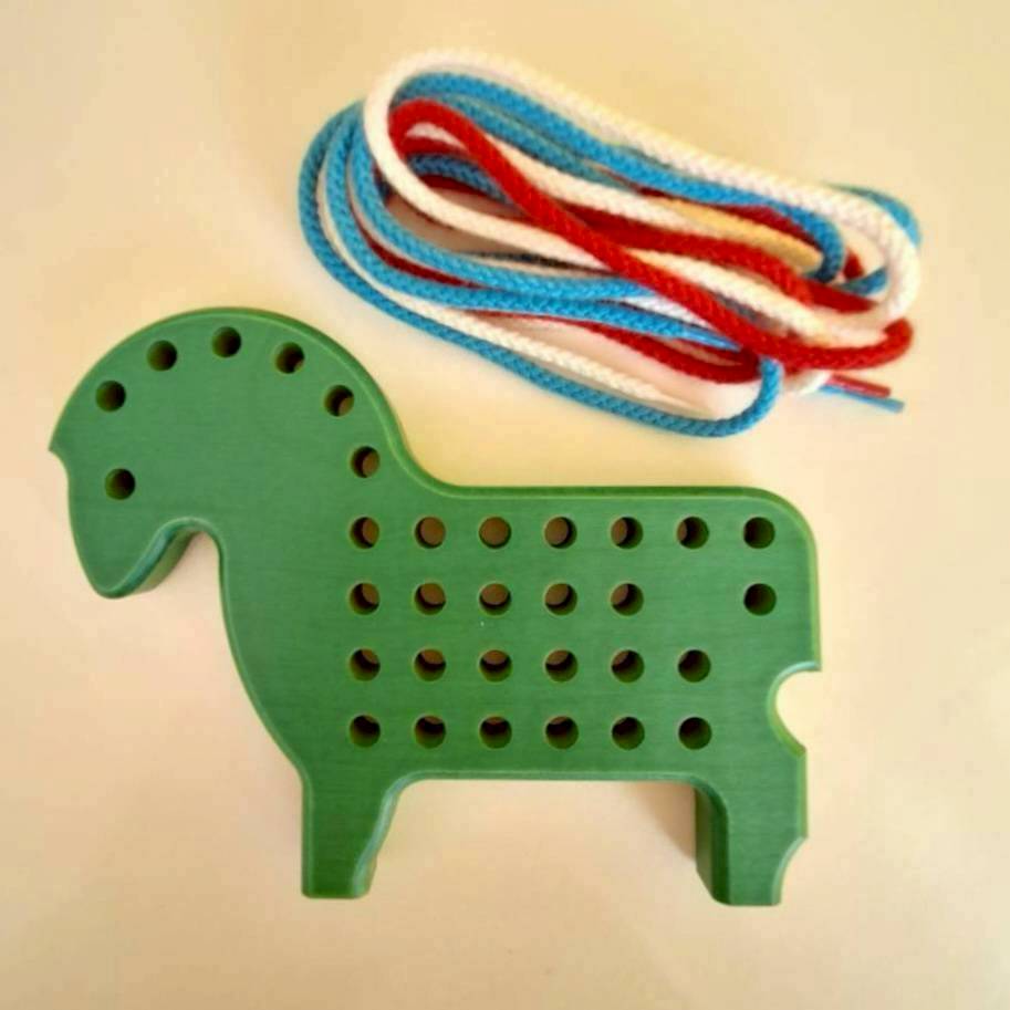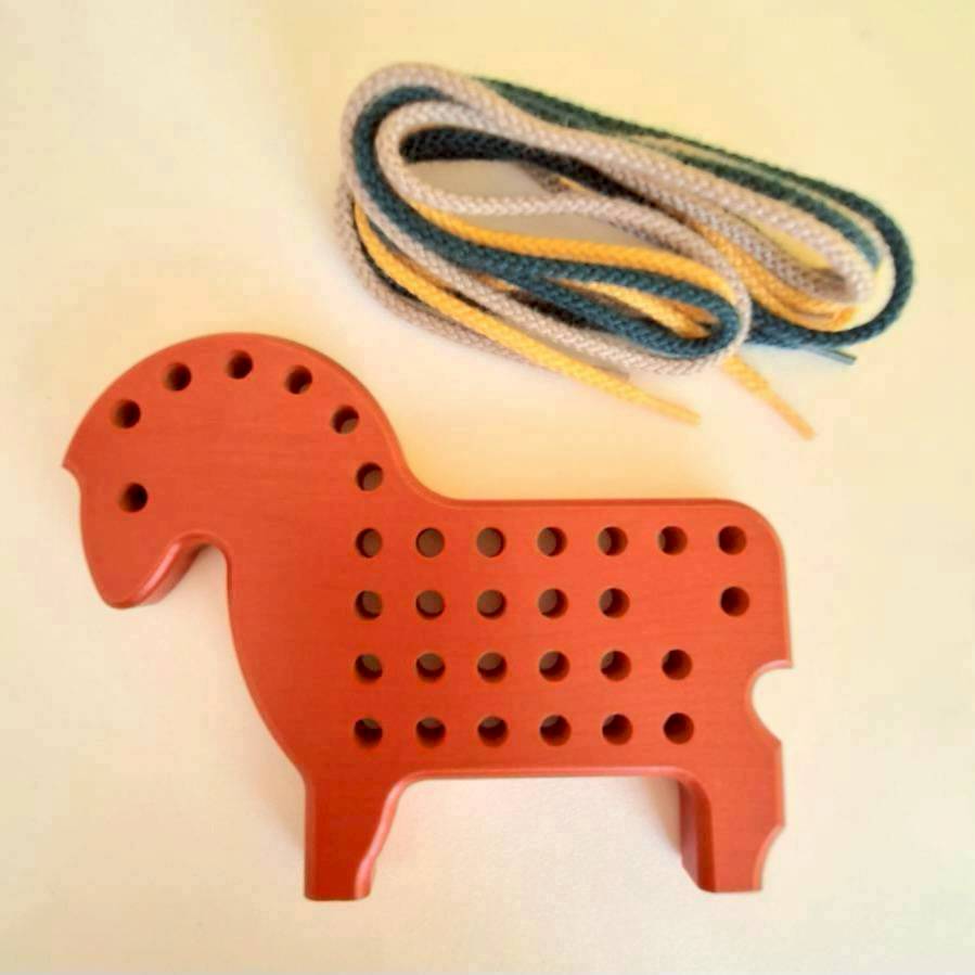 ループや結び目を作ってみると、思いがけなく楽しいポニーが完成します。1960年代から生き残ってきたひも通しの大先輩。ひも3本付。3才頃から。