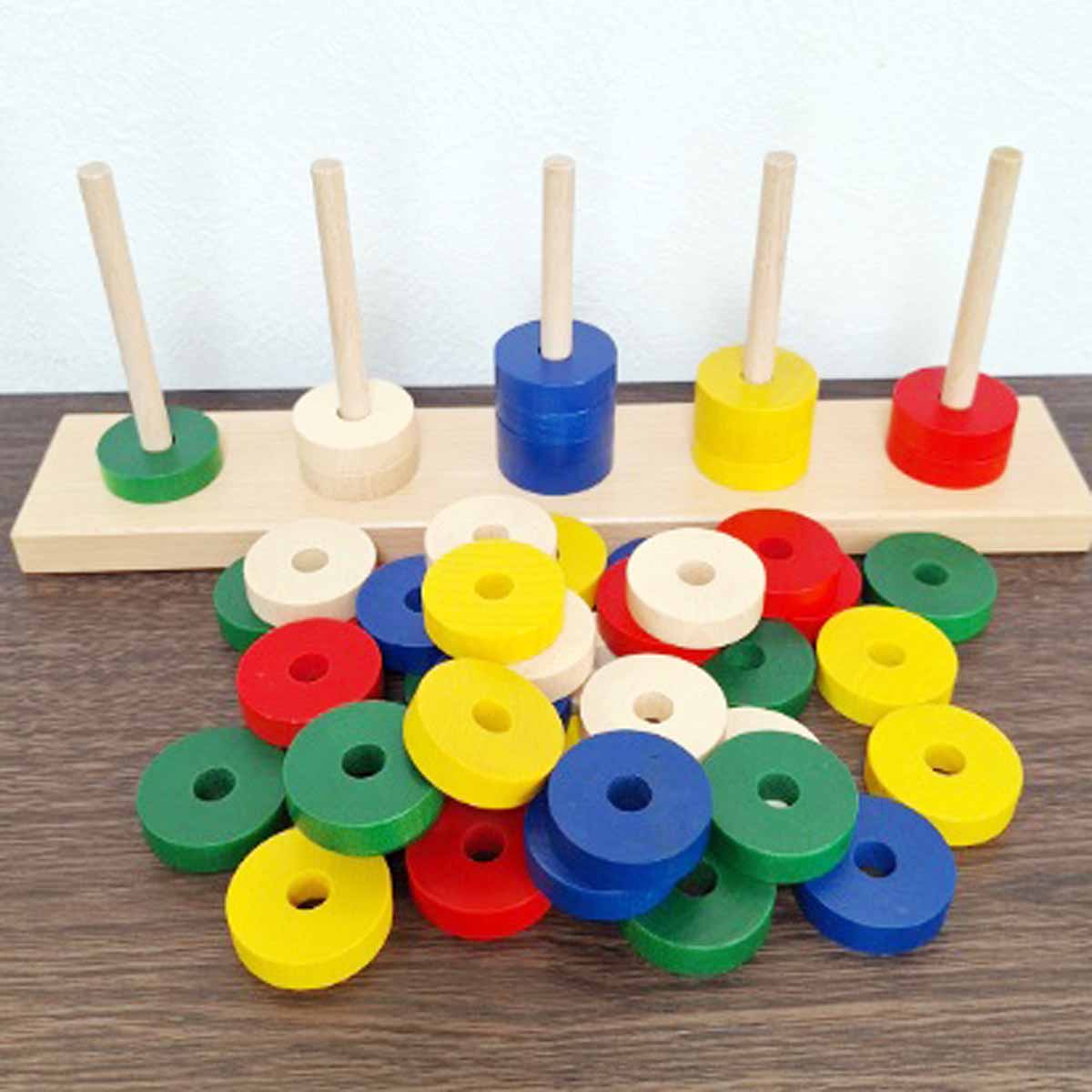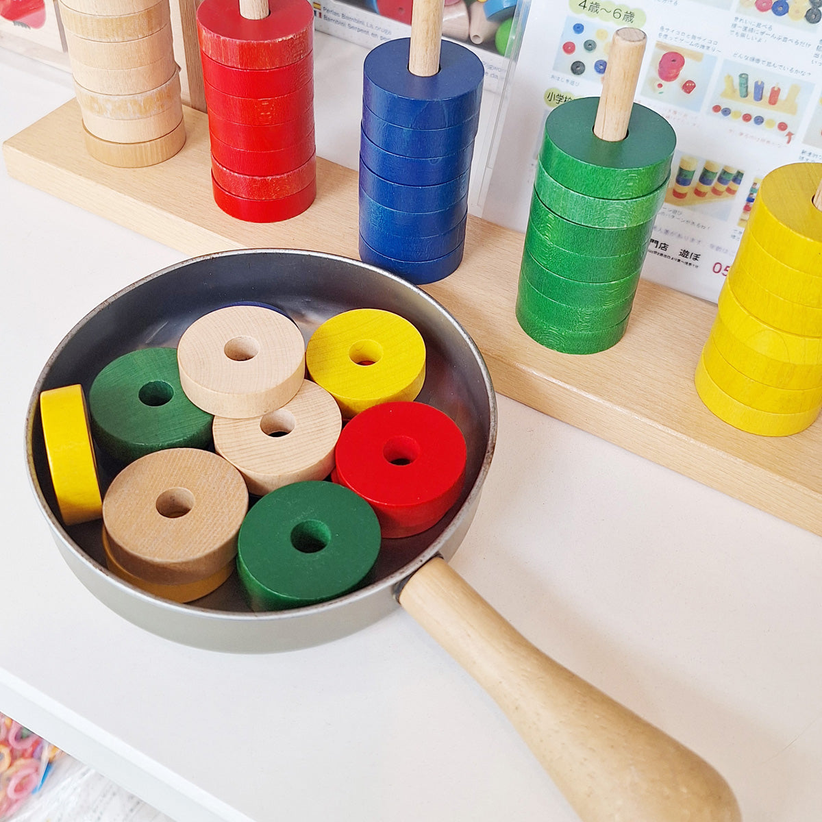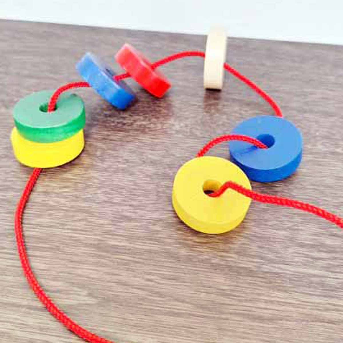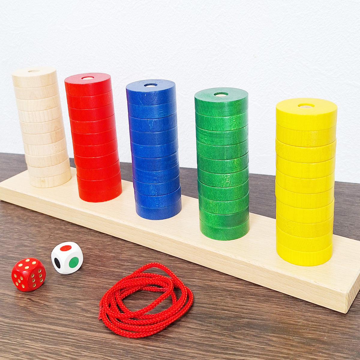 棒への抜き差しだけでなく、付属のひもとサイコロや、他の玩具と組み合わせて様々な遊びが広がるので、非常に長く遊べます。