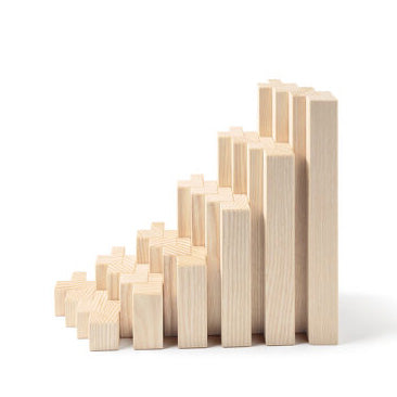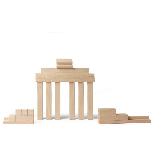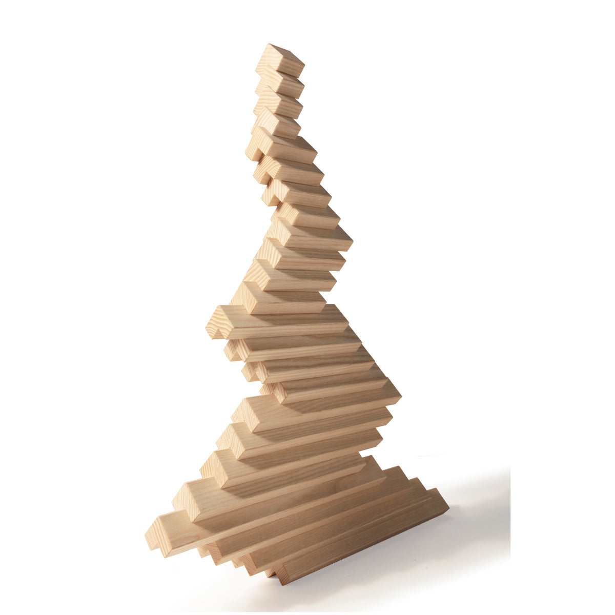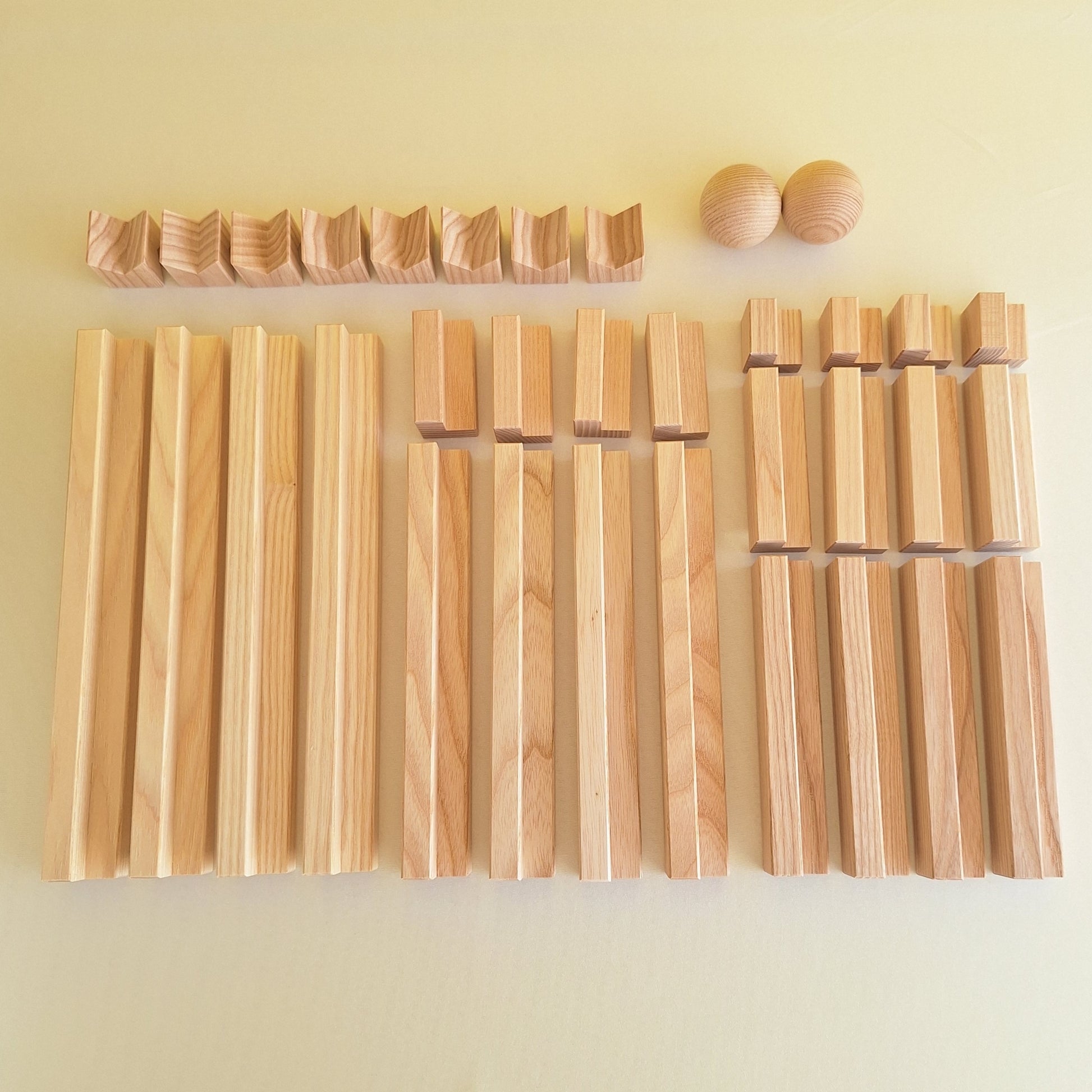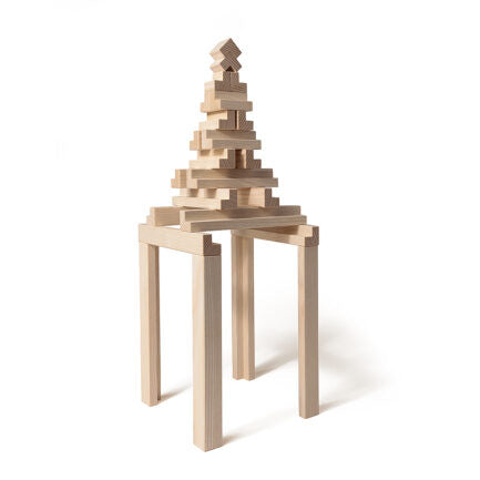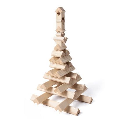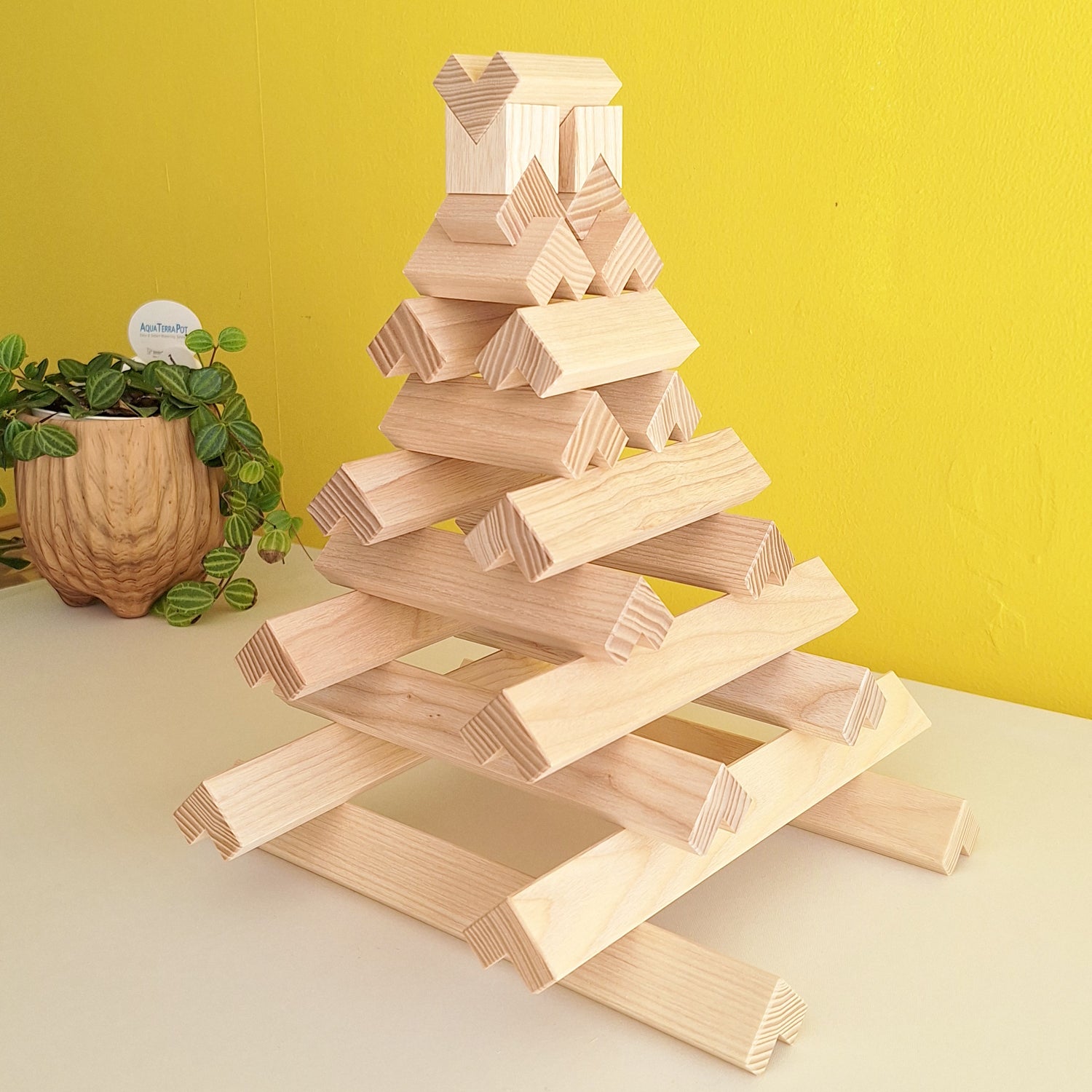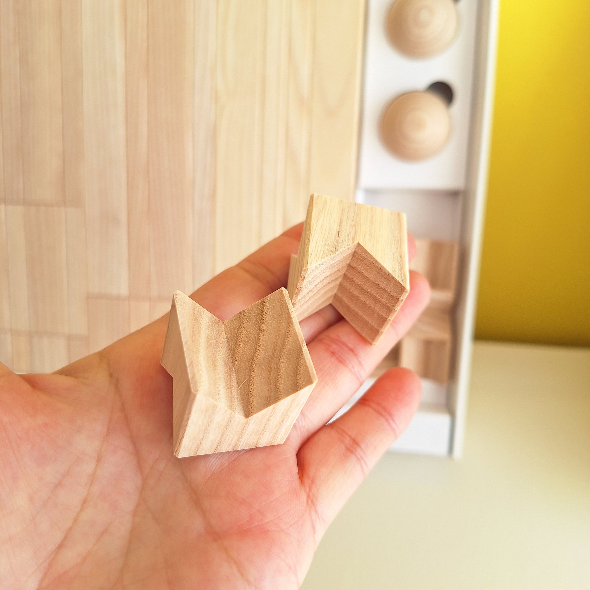L 字型で⾧さの異なる積木パーツと、スタンド、木の玉を組み合わせることで、多彩な造形あそびが楽しめます。